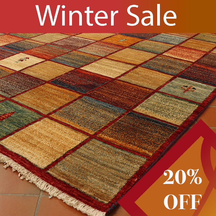 This fine Afghan Loribaft rug is an unusual statement piece. It is unique with its colour-blended, gridded design and the depictions of animals, plants, and humans randomly laid upon it. The colours in this piece include autumnal reds, blues, greens, golden yellows, and creams. In addition, a few randomly placed depictions of animals and people appear in some of the boxes.  Please click the hyperlinks in gold if you are interested in additional information. Afghan handmade carpets are increasingly well-regarded. This market has been growing quickly in recent years, emphasising higher-quality knotting and Pakistan's influence in many finishing processes, such...