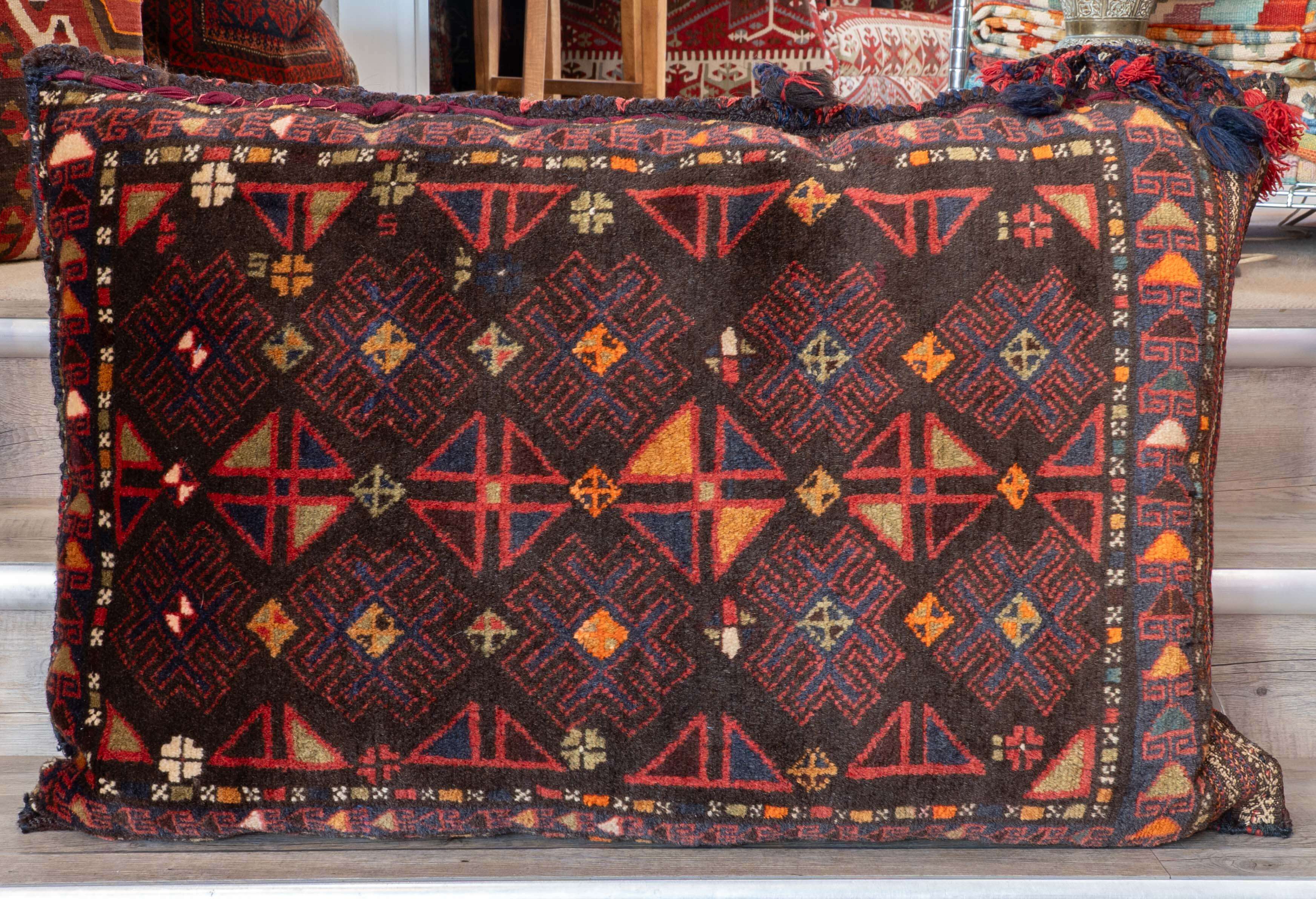 A bolesht bag is a long, narrow bag, usually with a carpet pile on one side and flatweave (kelim) on the reverse. Often, these will be decorated with tassels, beads, buttons and sometimes even shells. Tribal or nomadic people use the bags and normally store their bedding during the day, which also acts as a floor cushion. They are handmade from vegetable-dyed wool and often have loops threaded together and a stick fed through them so the bag does not lose its contents. They are generally in the red and brown colour spectrum, with a traditional design used by that particular tribe.