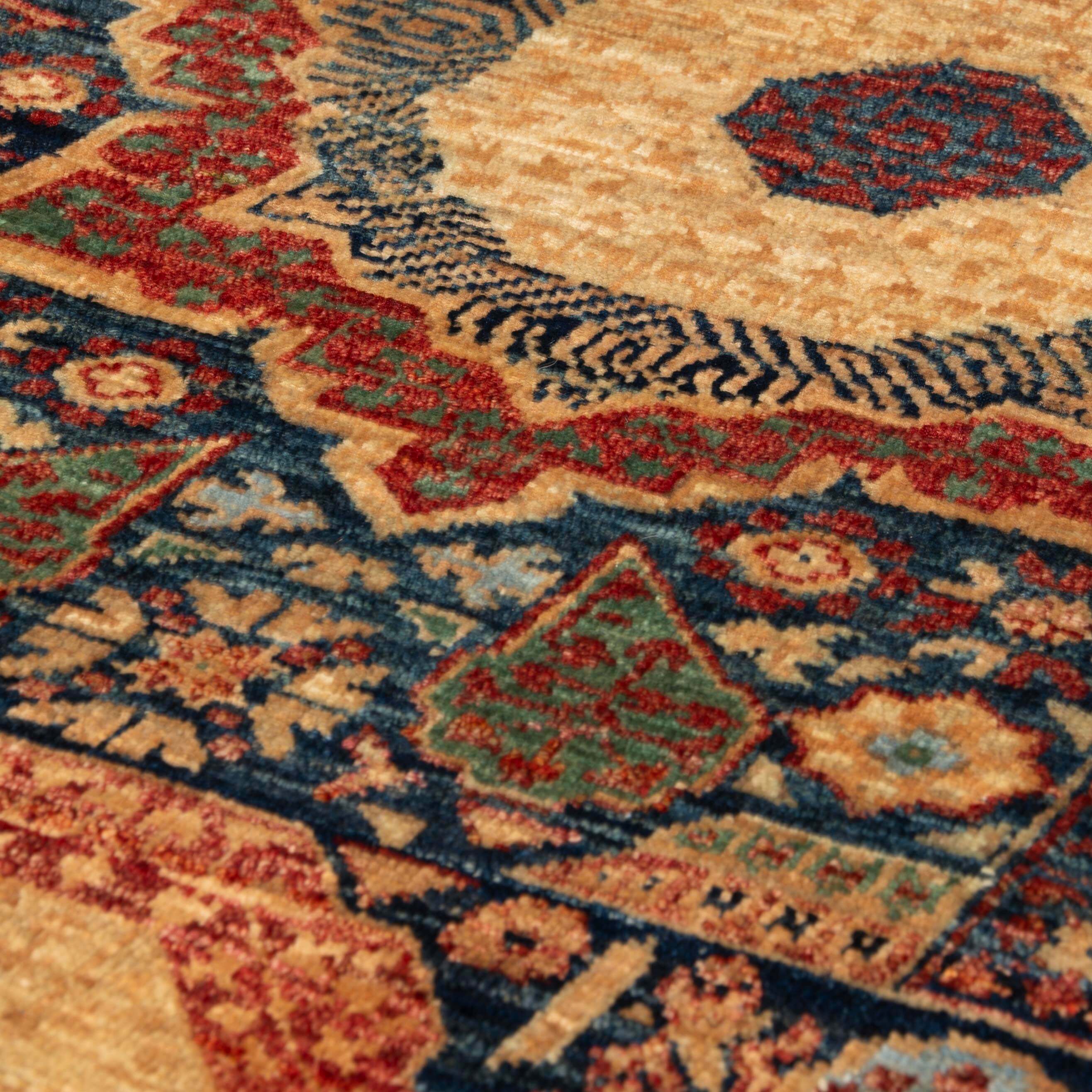 This unique and varied collection is produced in northwest Afghanistan and has a similar construction to the Ziegler rugs. The wool is sheared by hand from the indigenous Karukal sheep. It is handspun using natural vegetable and mineral dyes. These pieces have utilised attractive old Persian designs and patterns from unusual museum pieces. They are generally more vibrant colours and less muted shades. However, the exciting and uplifting colours remain almost Jewel-like. The final finishing processes are carried out in Pakistan, where some post-production occurs; this will mean alignment corrections, surface clipping and tumbling, and the washing mentioned earlier.