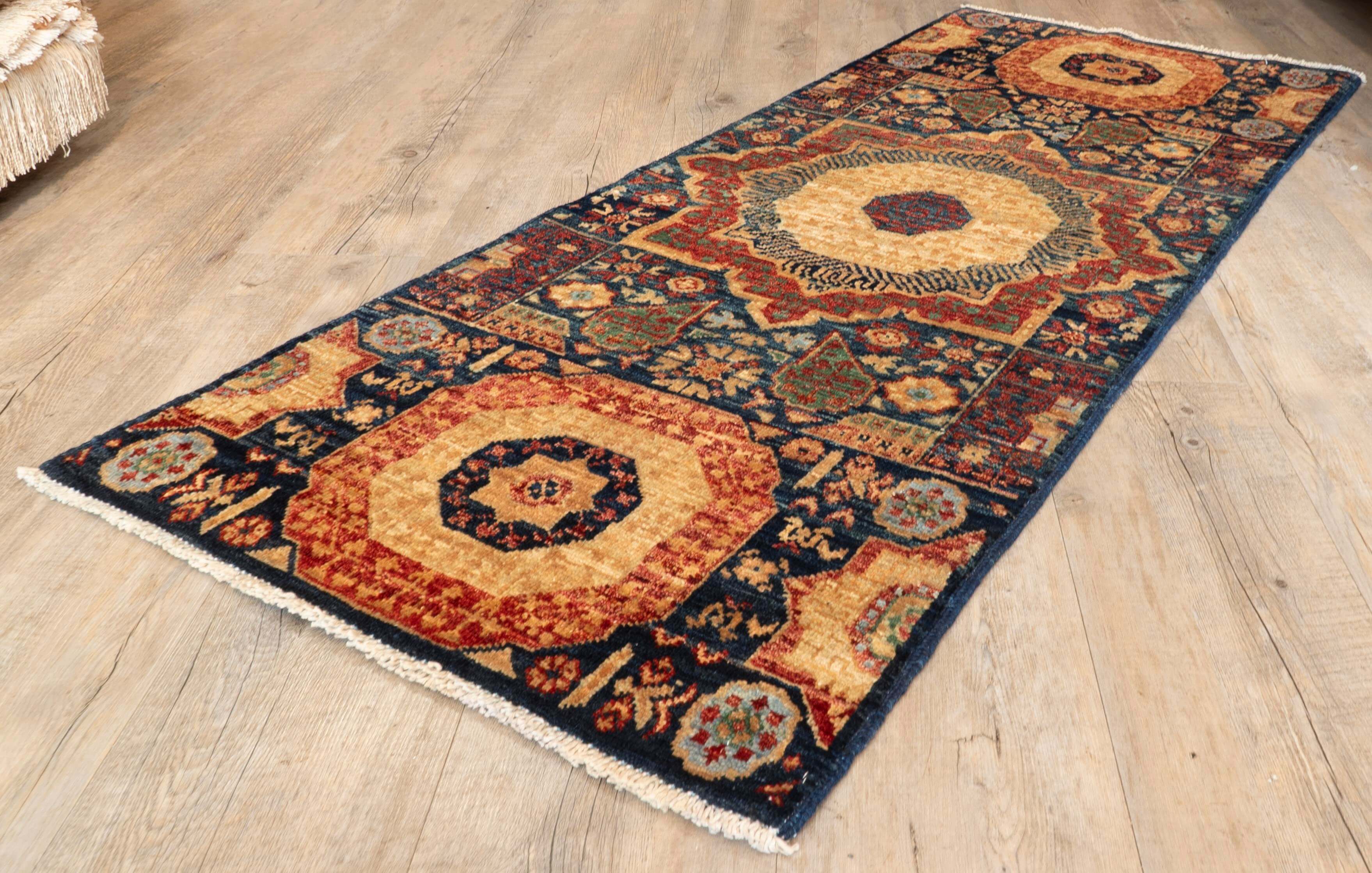 Skilled artisan weavers craft this short runner, a masterpiece of the traditional cottage industry. It will surely bring timeless elegance to your hallway, corridor, or landing. The vegetable-handspun wool is hardwearing and practical, while the classic navy blue, red, and gold medallion design lends a luxurious, exclusive feel. This beautiful runner will add an air of sophistication to any home.