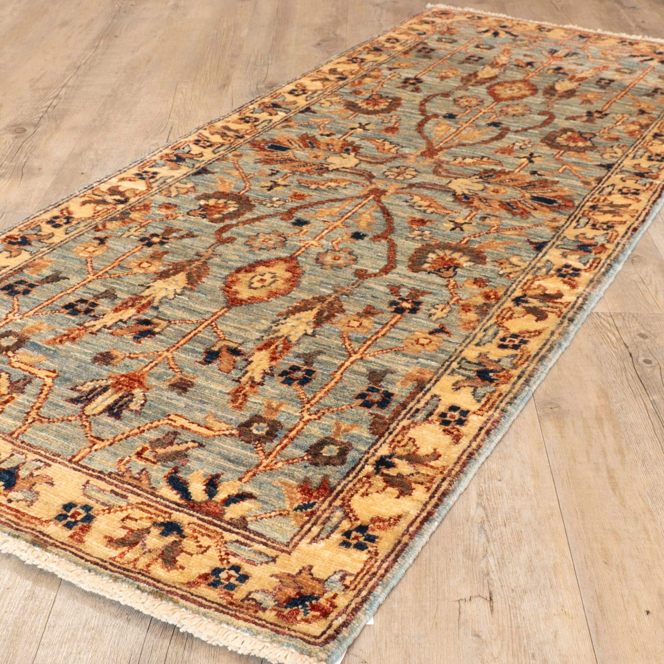 Enhance your living space with this handmade Afghan Choeb Rang short runner, with a soft duck egg blue background and floral design—the blue offers subtlety, while the durable wool construction ensures lasting quality. Elevate your décor with a piece that combines artistic uniqueness and enduring craftsmanship, moving beyond the ordinary to bring a sophisticated touch to your home.
