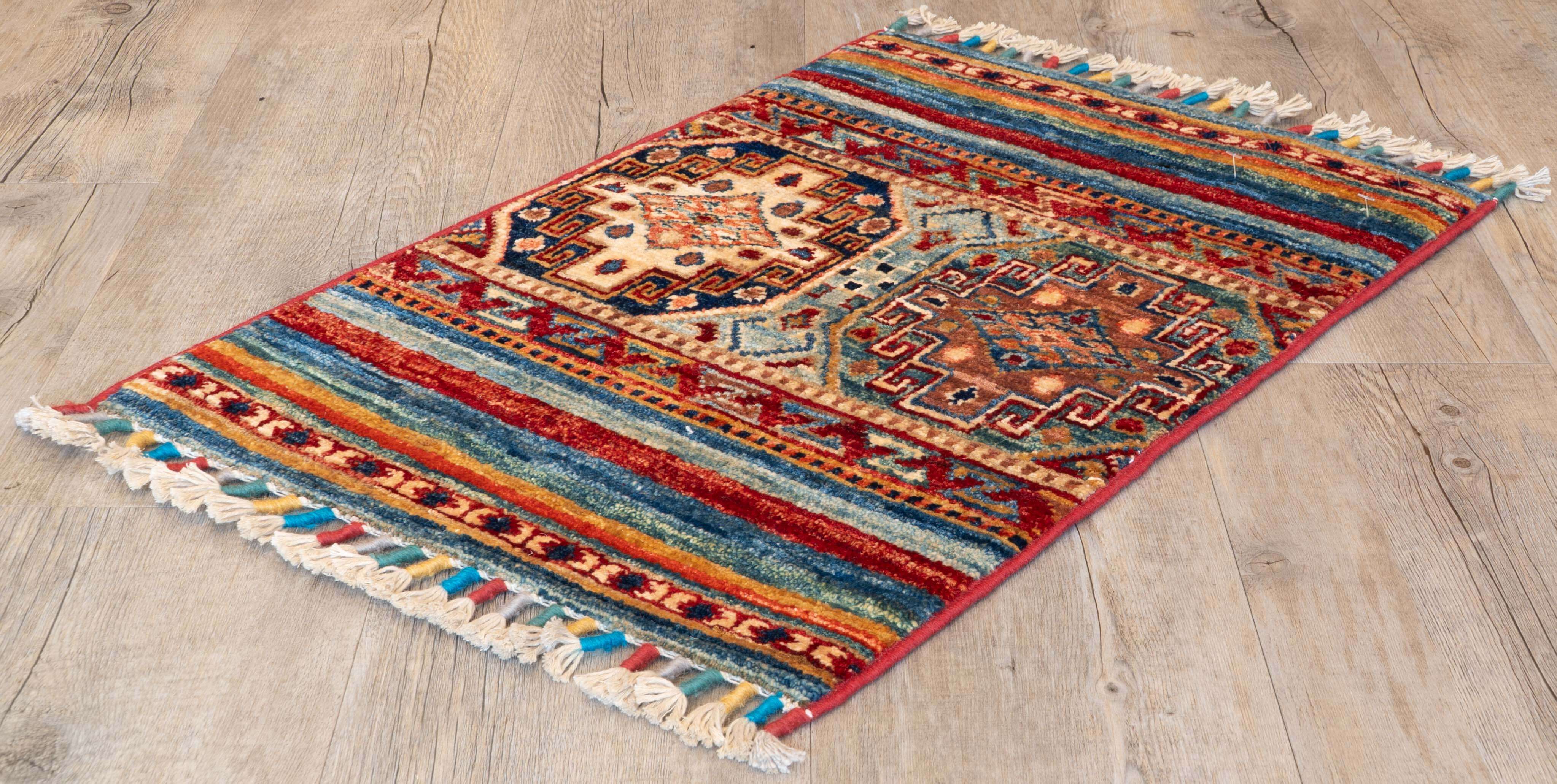 Handmade with handspun vegetable-dyed wool, this colourful Afghan Kharjeen mat is just waiting for someone to find a little space to fit in. Practical and hardwearing, it is made from Karakul wool from Afghanistan. The design cleverly mixes traditional and contemporary elements to create a work of art.