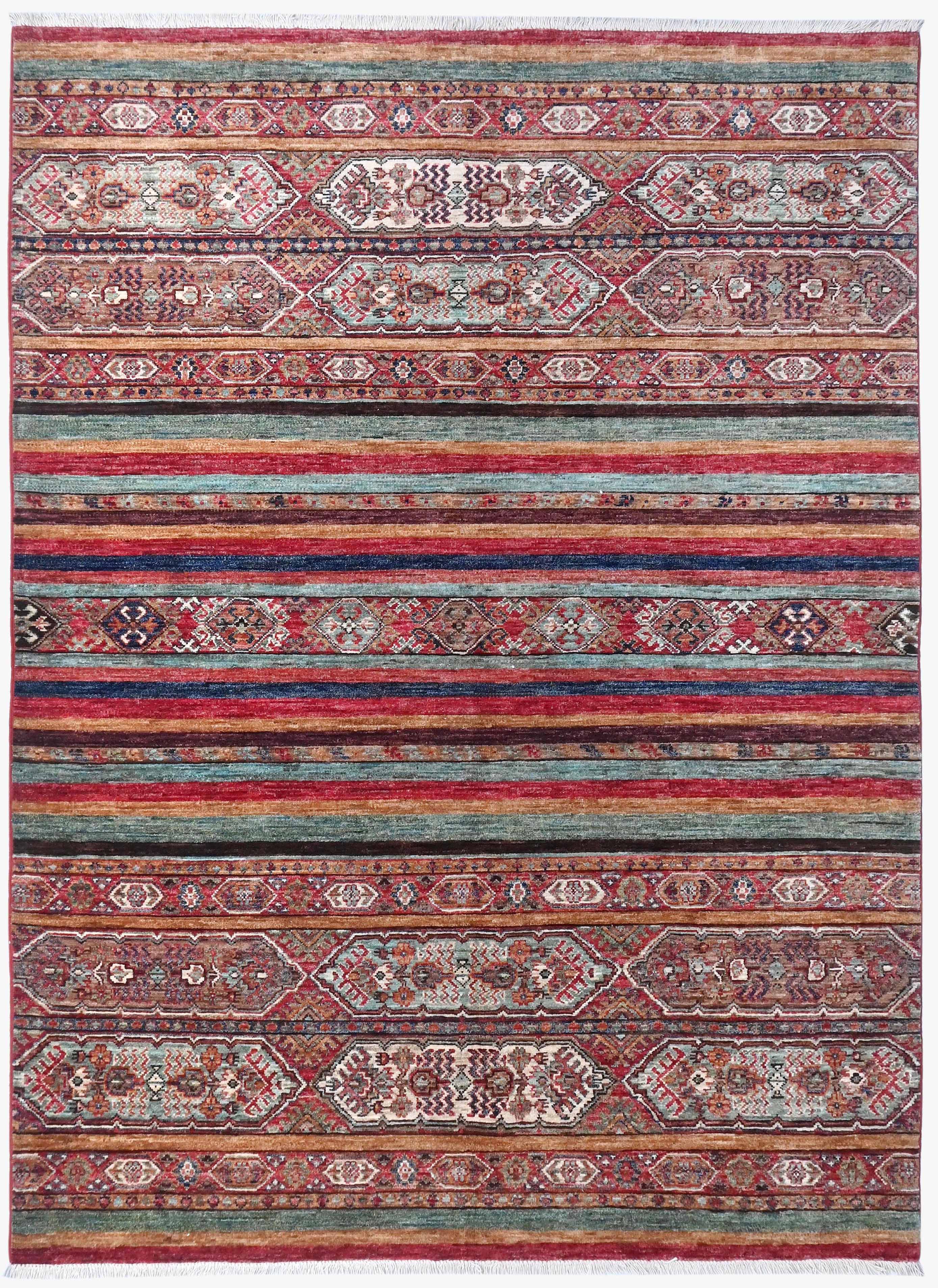 Kharjeen (Khorjin) rugs, runners and carpets are still hand-knotted, and the wool is coloured with vegetable dye. The Kharjeen (also known as Khurjeen) rug designs can be reminiscent of Gabbeh designs. The colours of the Kharjeen rugs and carpets are similar in many ways to those used in our Samarkand and Loribaft collections. Some Kharjeen pieces do not have fringes and are finished with a plain kilim end or binding secured to prevent fraying. The other rugs are generally produced like the Samarkand carpets with an unusual bobbin wind on the warps.