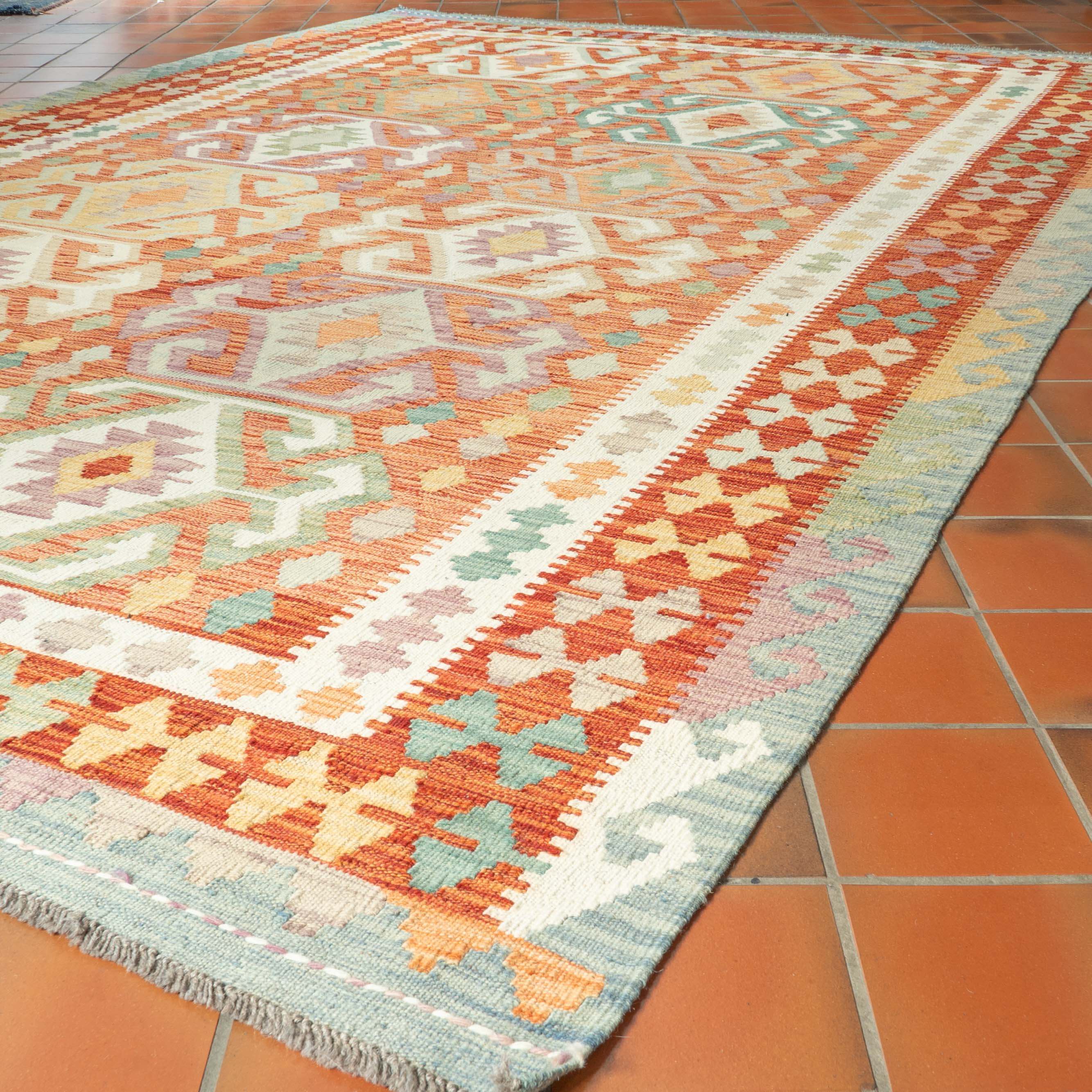Experience the quality and tradition of Afghan craftsmanship with our handmade terracotta kilim. This flat-weave kilim is woven from traditional, vegetable-dyed wool, making it durable and ideal for use with underfloor heating. Its colourful and striking design is reversible, allowing it to be used as a floor covering, wall hanging, or throw. Elevate your space with this stunning and affordable piece.