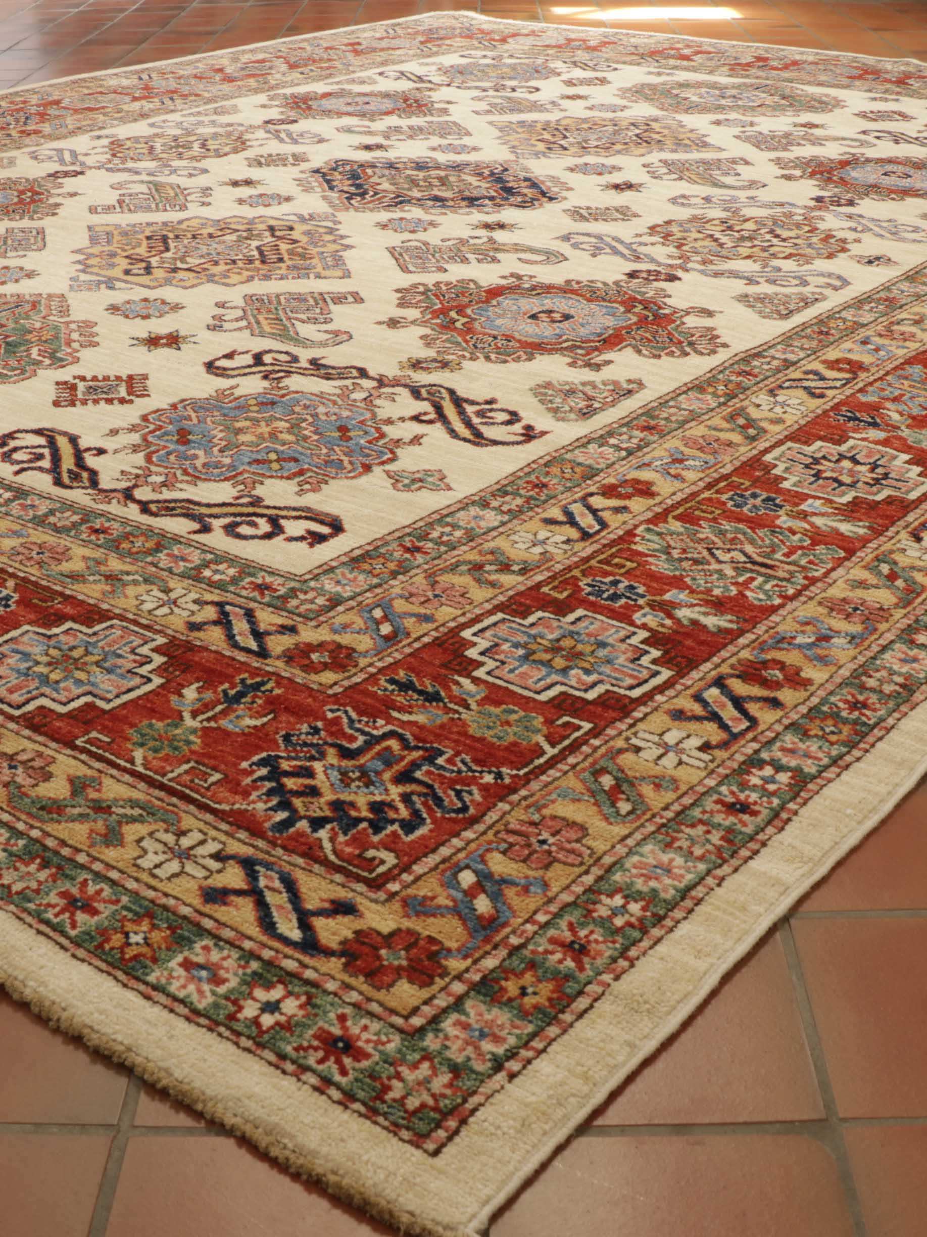 Treat yourself to a luxurious handmade fine Afghan Kazak carpet, crafted using centuries-old techniques employing vegetable-dyed, handspun wool and lovingly woven by skilled artisan weavers from Northwest Afghanistan. The wool pile and cotton foundation make for a fine-quality creation, with a cream background beautifully offset by a terracotta border and gold, green, and soft blue accents—a timeless piece of craftsmanship.