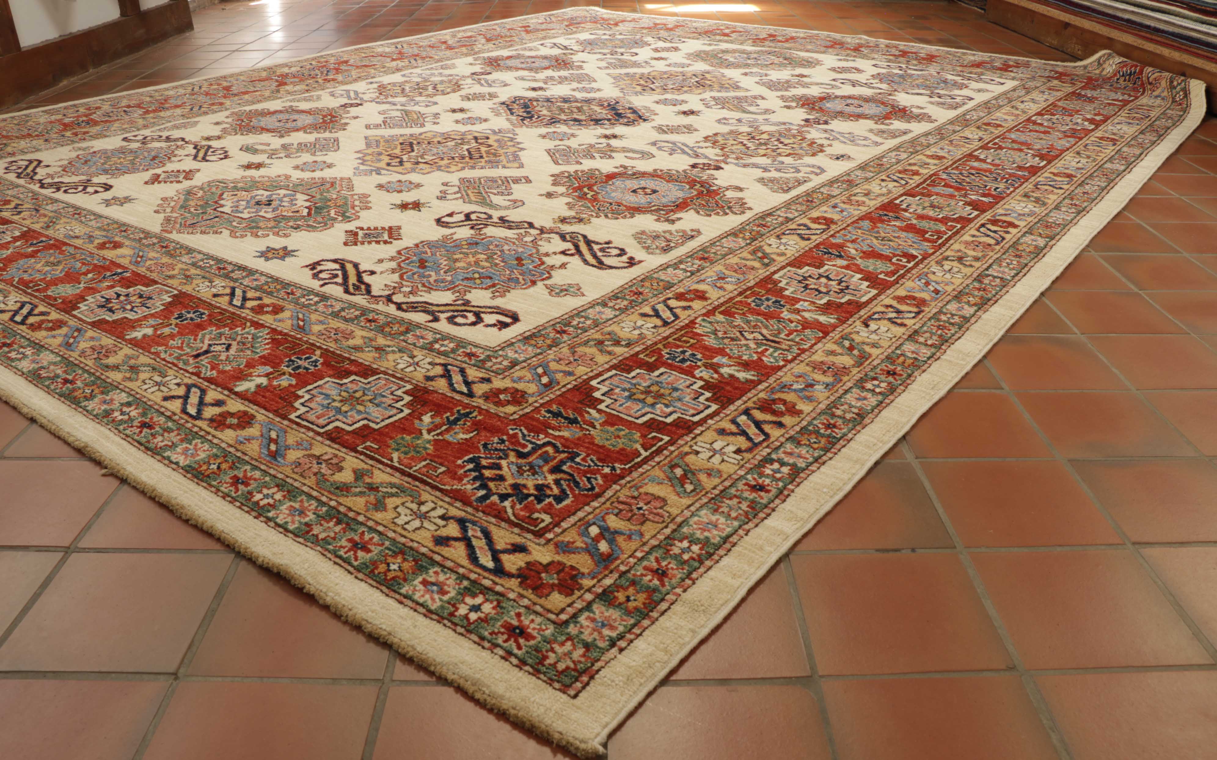 Although Kazaks are hand-knotted in Afghanistan, the design originates from the Caucasus. The short pile emphasises the sharpness of the pattern. Each piece is made using excellent Afghan wool, usually spun in Ghazni. The Afghan wool is generally slightly coarser and more curly than other wools and is perfect for carpet weaving. Afghan Kazak carpets are traditionally made with bold geometric designs in intense, vibrant colours such as rich reds, warm terracottas, and shades of blues with soft golds and creams.