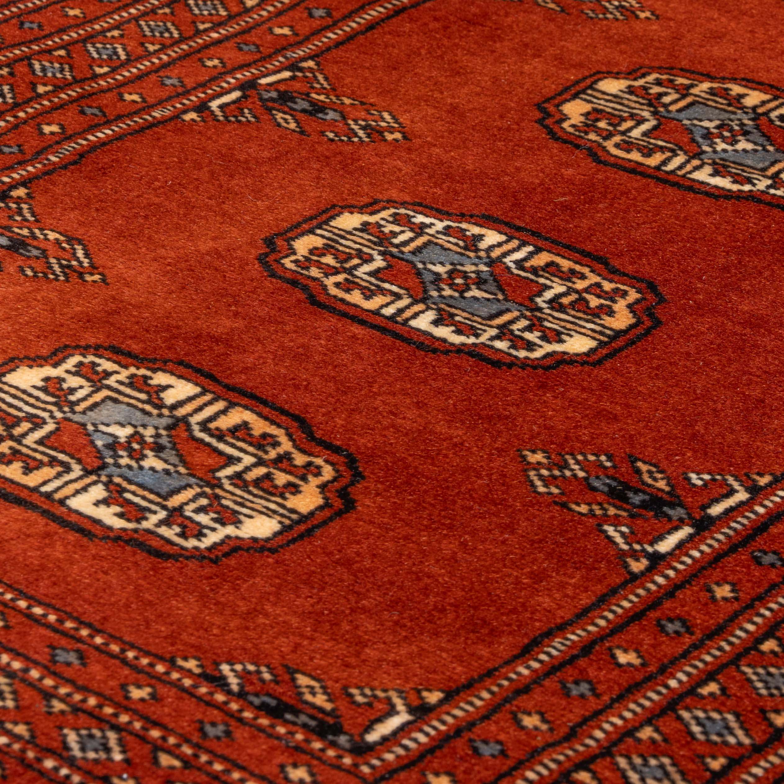 The well-known Bokhara design originates from Uzbekistan, where the nomadic Turkoman tribespeople first took their rugs to be sold. The repetitive octagonal motif, known as a "gul" (Persian for "rose"), is a characteristic feature of Bokhara rugs. Today, Pakistani people weave this design in a wide range of colours and sizes.