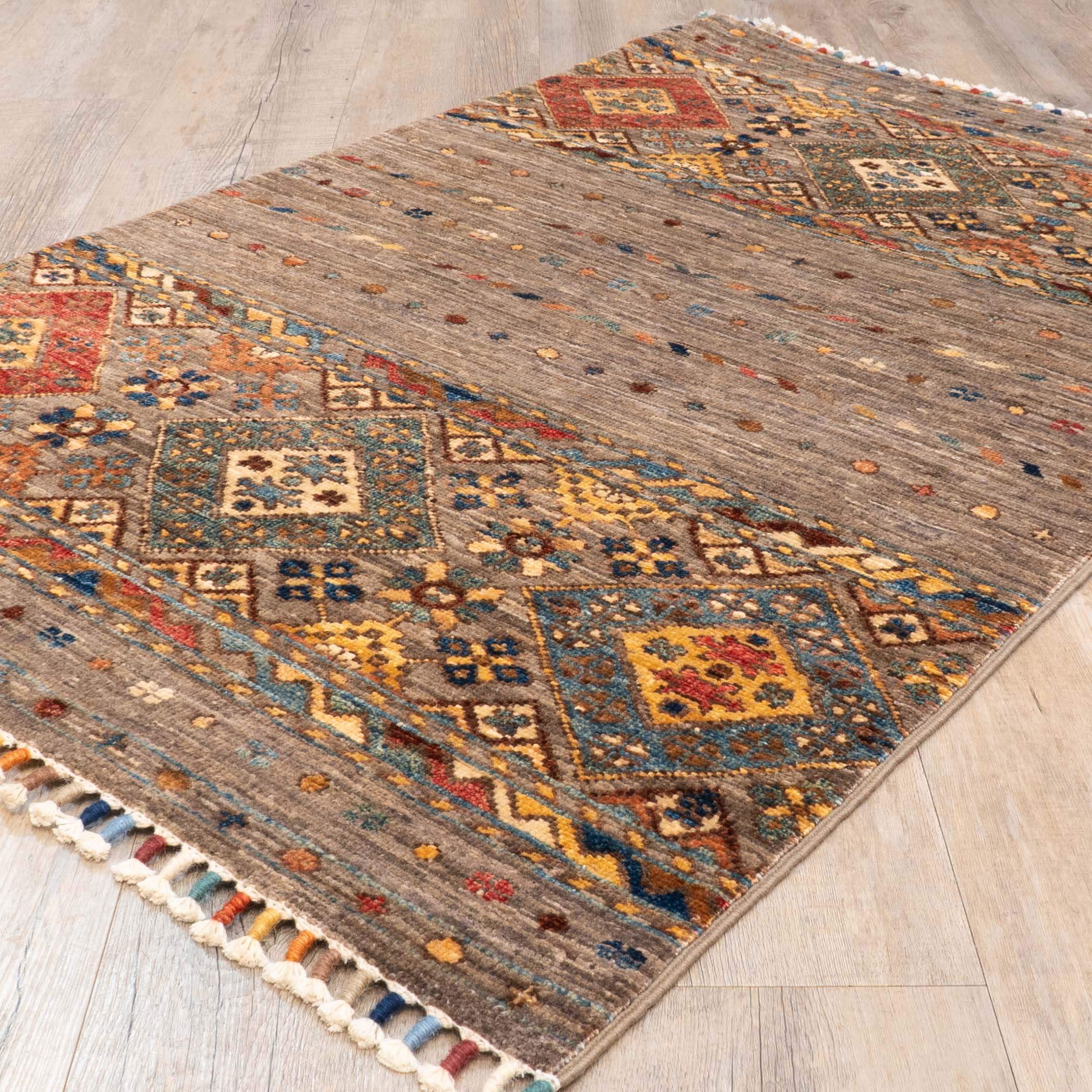 Hand-knotted Afghan Samarkand rugs and carpets are a relatively new production for us. We always look for something different or unusual, which certainly ticks that box. These rugs make a striking statement with their beautiful colours and the mixture of traditional and modern design. Samarkand rugs have been made recently in northwest Afghanistan, and the name has been given to their unique design. In Uzbekistan, Samarkand is as famous as Bukhara for being on the Silk Road, which links China with the West. We hope you also like this fascinating, colourful carpet as much as we do.