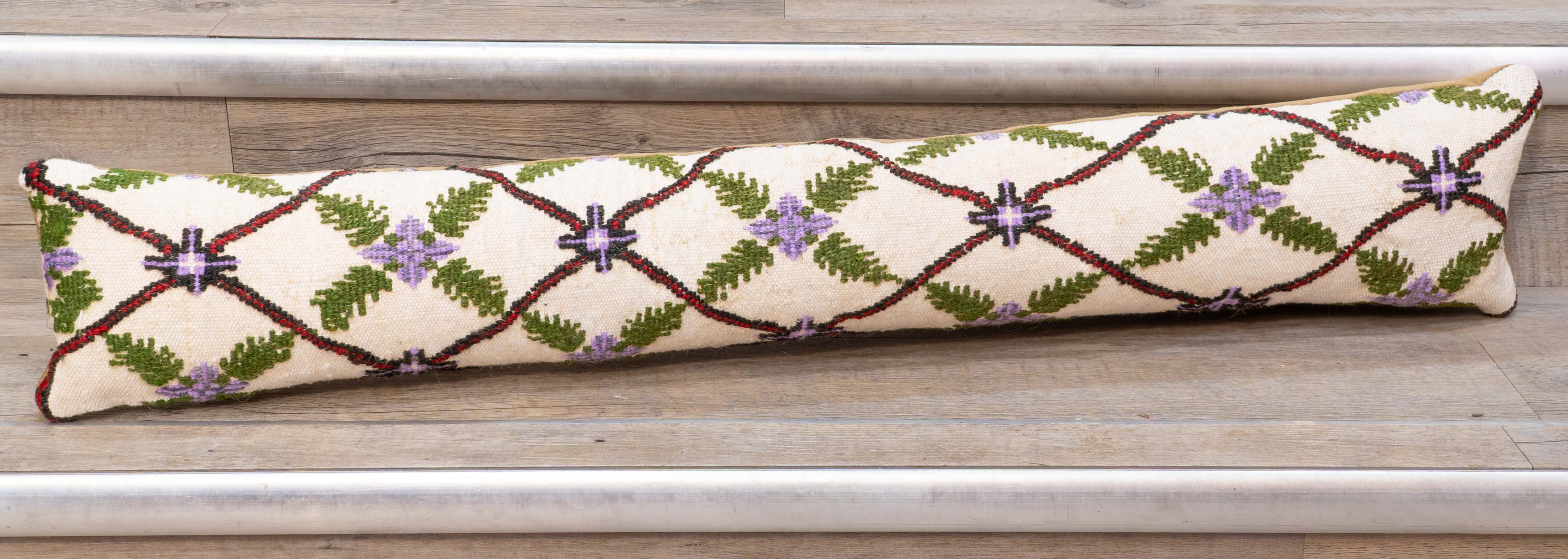 We are fortunate to have these draught excluders on the website; the old kilims are becoming harder to find and quite desirable. This lovely draught excluder is made from a salvaged piece of Turkish Kilim. It is single-faced with a faux suede/linen backing and is fibre-filled. Each draught excluder is a unique item and is not repeatable.