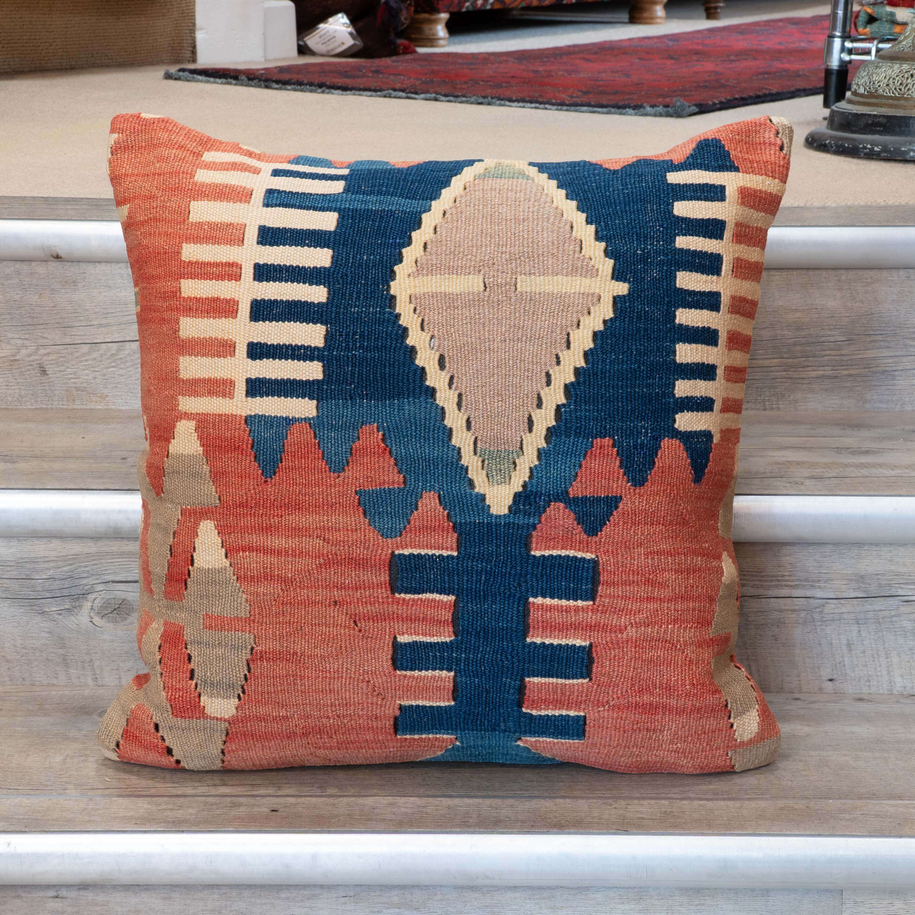 Our collection of kilim cushions offers great colours, designs and textures. The pieces are often taken from a larger old, sometimes antique kilim, cleaned and sorted to repurpose and salvage a treasured fabric that otherwise could be lost. The pattern may be cut in unusual and interesting ways to ensure as much of this precious resource can be saved. In addition, the cushions are fibre-filled, making them more suitable for individuals with allergies to feather fillings.  Product size: 50 x 50cm (20" x 20")